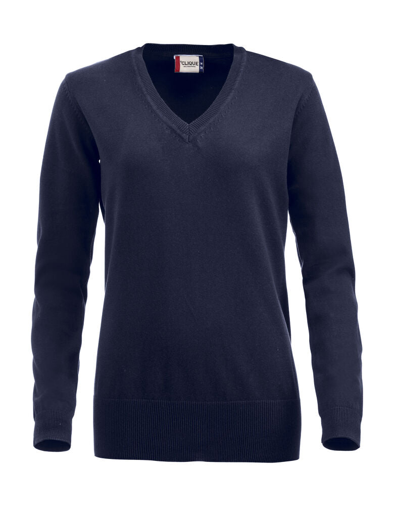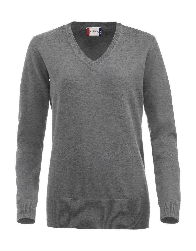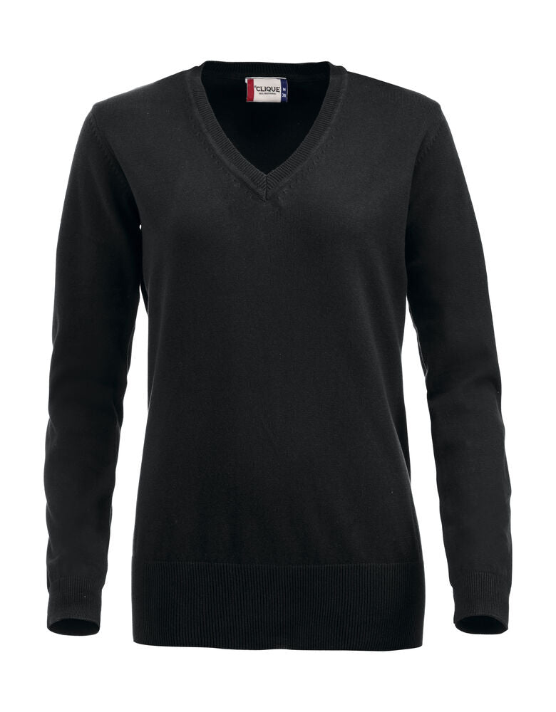 V-ringad stickad tröja med fully fashion-stickning. Silikonbehandlad för en mjukare känsla. Elastan i den ribbade mudden både i ärmslut och nedtill.