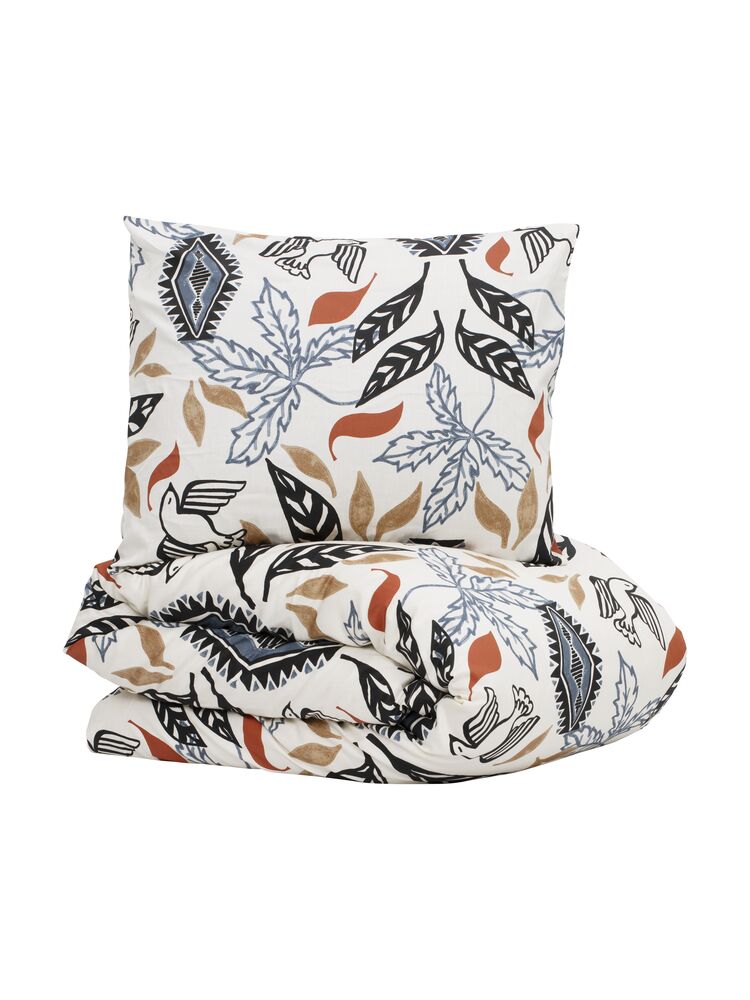 Ett mönstrat bäddset i satin med motiv av fåglar, blad tillsammans med en dekorativ kant runtom. Ger sängen ett levande uttryck utan att ta över. Mjukt, lätt och skönt att sova i.