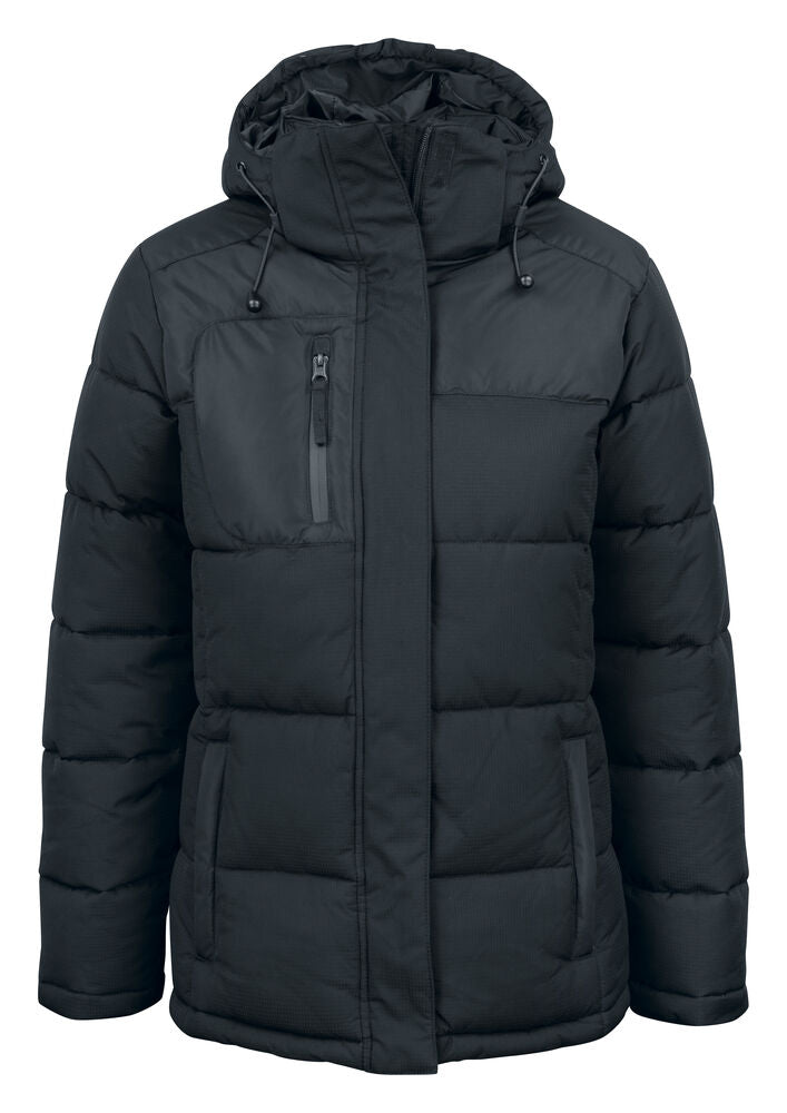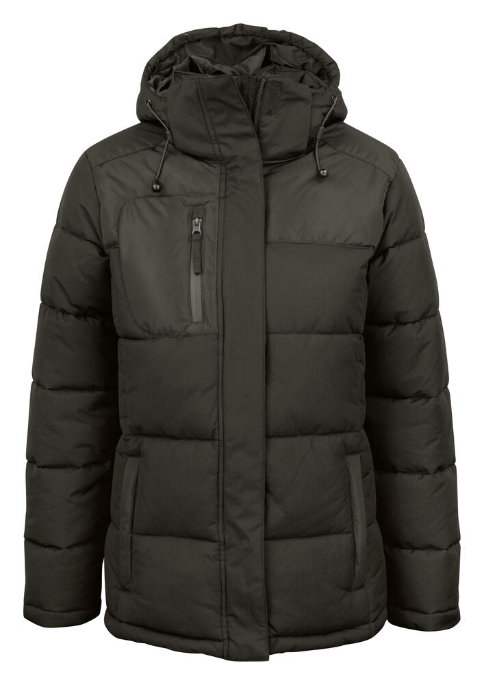 En varm vadderad vinterjacka utrustad med vattentäta SBS dragkedjor på bröst- och framfickor. Avtagbar och justerbar huva. Två stora innerfickor i mesh. Dragsko nedtill och dammodellen har även dragsko i midjan. Ribbad 2x2 innermudd i ärmslut.