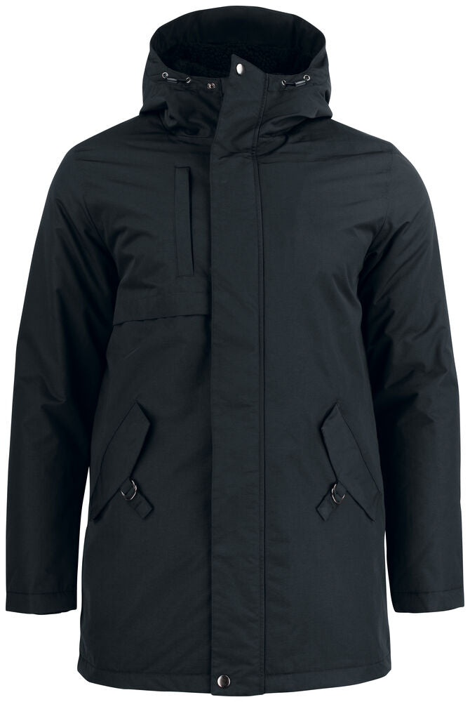 Modern vadderad parkas med fast huva och ett härligt teddyfoder i huvan. Jackan är utrustad med bröstficka med dragkedja, två framfickor med magnet och en innerficka med dragkedja. Kviltat foder och dragsko nedtill.