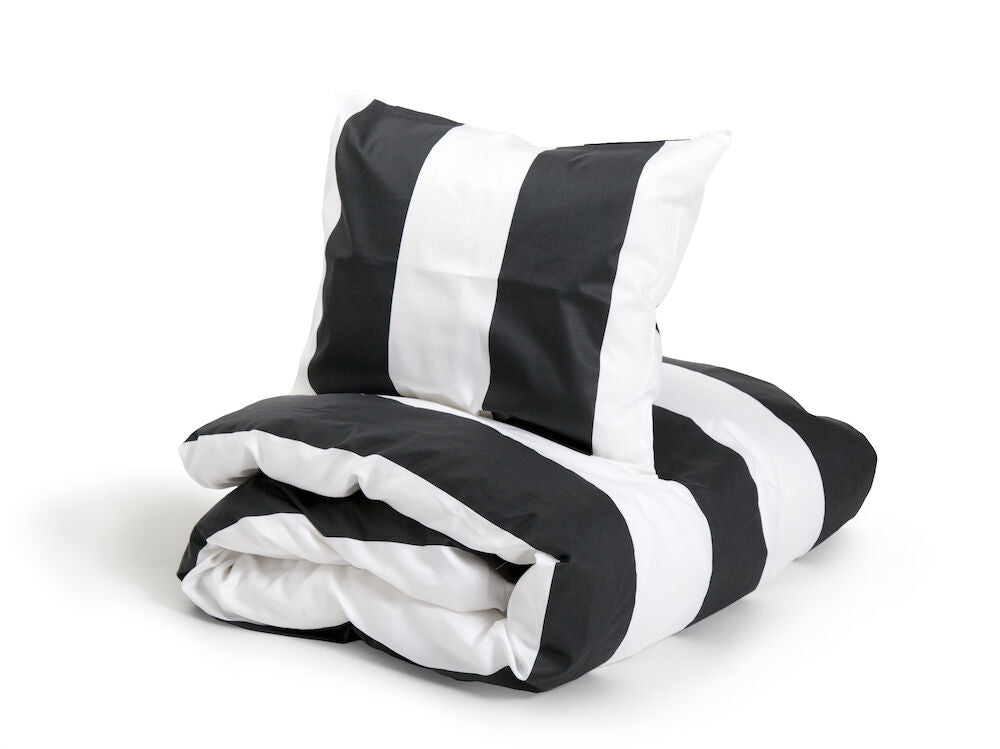Bäddset av mjuk bomullsatin med breda lodräta ränder.