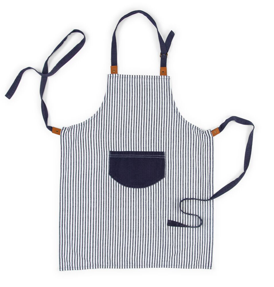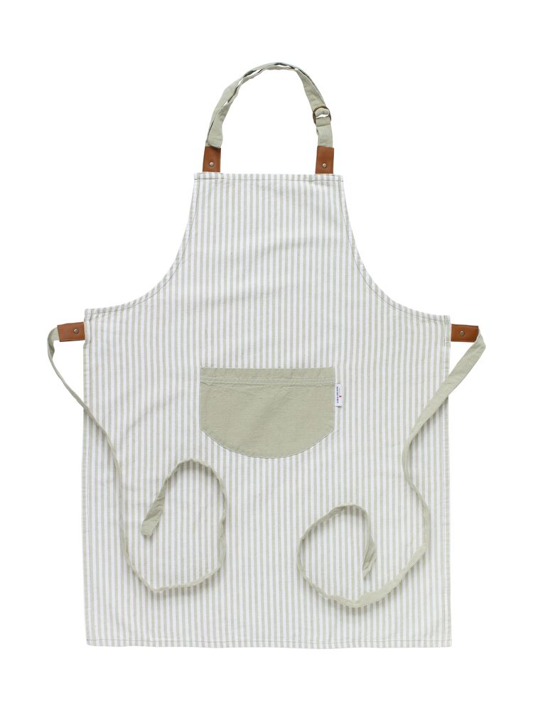Unna dig själv eller någon annan matlagningsfantast ett fint förkläde. Detta förkläde har en enkel look med fina ränder, tillverkat i bomull och linne. Förklädet är försett med en praktisk ficka fram och har justerbart knytband i midjan och i nacken med konstläderdetaljer. Perfekt för både honom och henne! Matcha gärna med grytlappar och grytvante i samma serie.