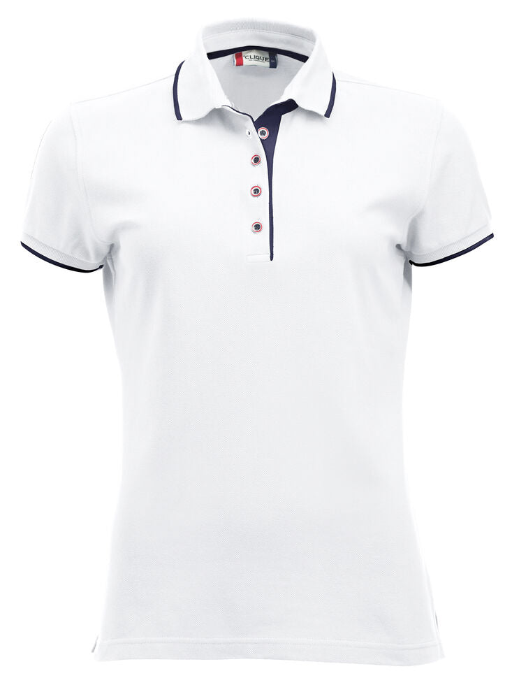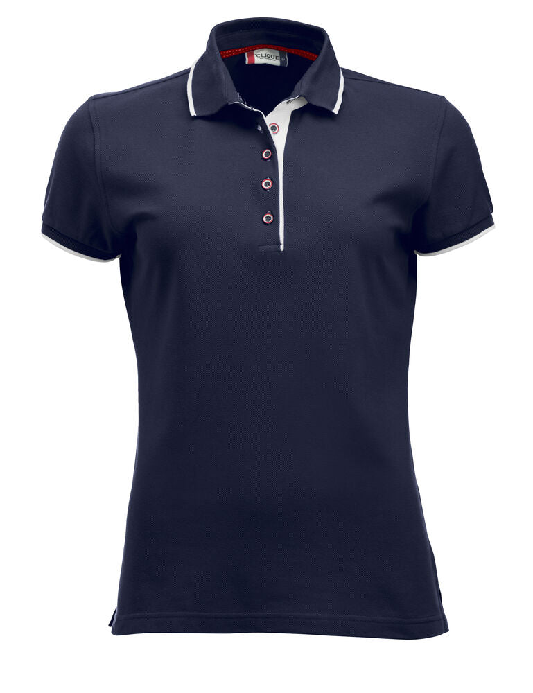 Piké med färgkontrast i knapp, nackband, knappslå och sidslits. Stående skjortkrage och knappslå med tre knappar på herr och fem knappar på dam. Kontrastrand på krage och ärmavslut.
