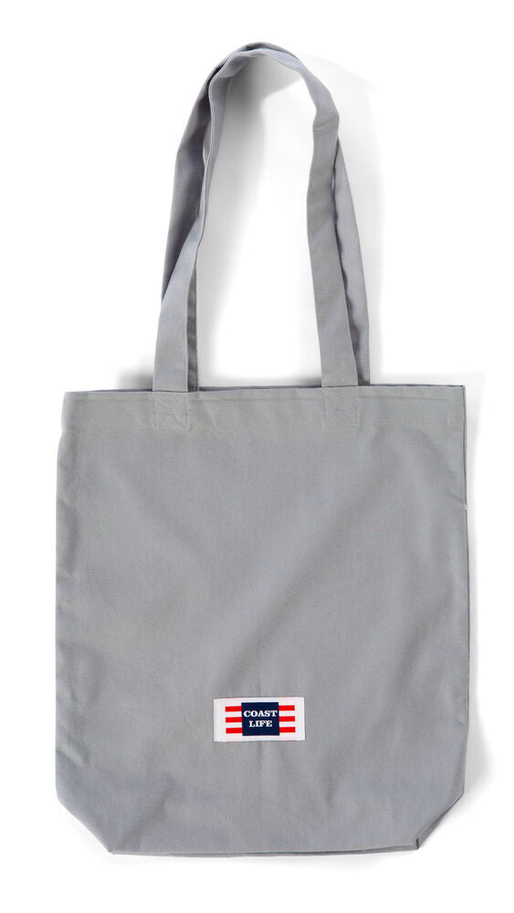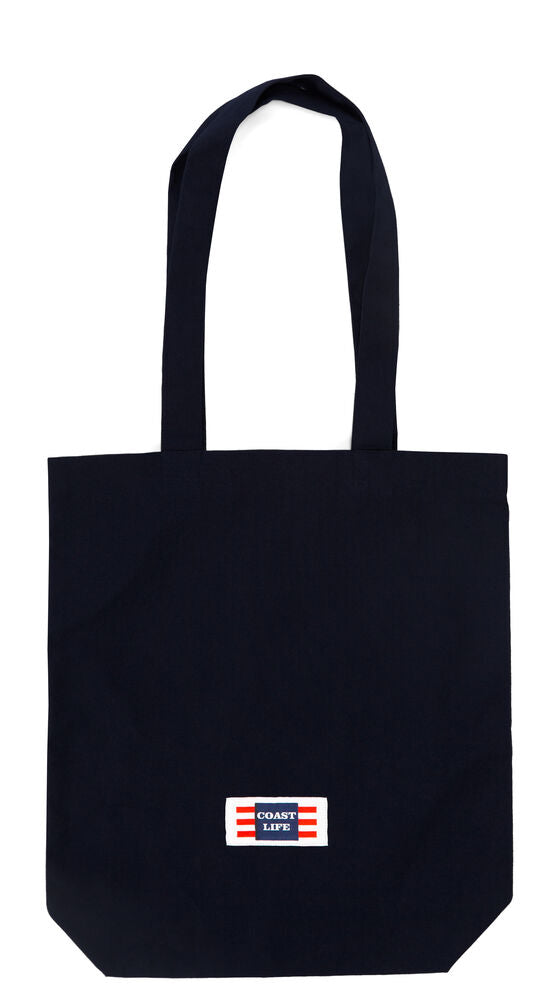 Tygväska Kustliv i kanvastyg från Lord Nelson Victory. En praktisk och tålig tygväska i fyra olika färger med etiketten ”Coast Life”. Tygpåsen har en sydd rektangulär botten och lämpar sig bra till att ställa exempelvis en flaska i. Väskans långa handtag är anpassade för att kunna hänga på axeln. Passar lika bra att bära badkläderna i som att använda till shoppingväska.